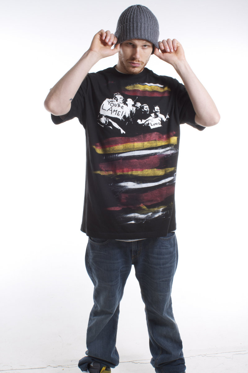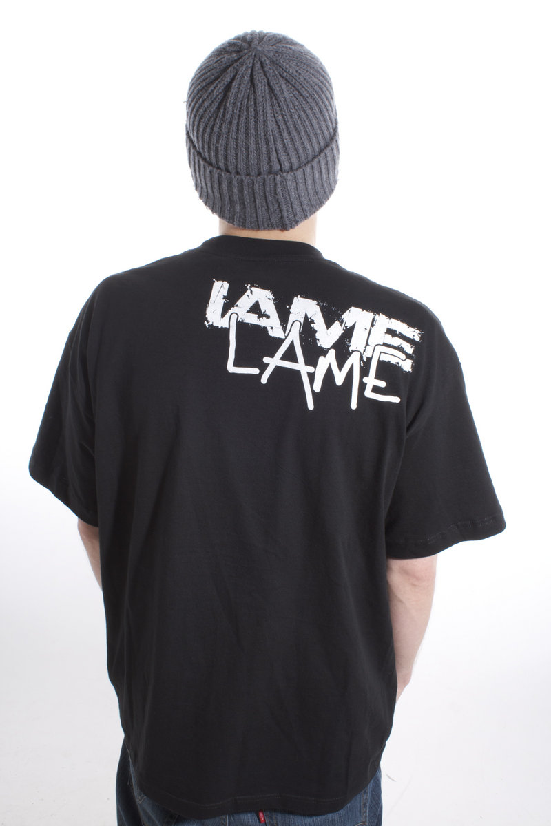 One of a kind "Lame" t-shirt (designed & painted by SOMEONE). The picture above shows IAME sporting a custom t-shirt but none of them will be exactly the same design or colors. These t-shirts won't be made until ordered, so it might take up to two weeks to ship out.